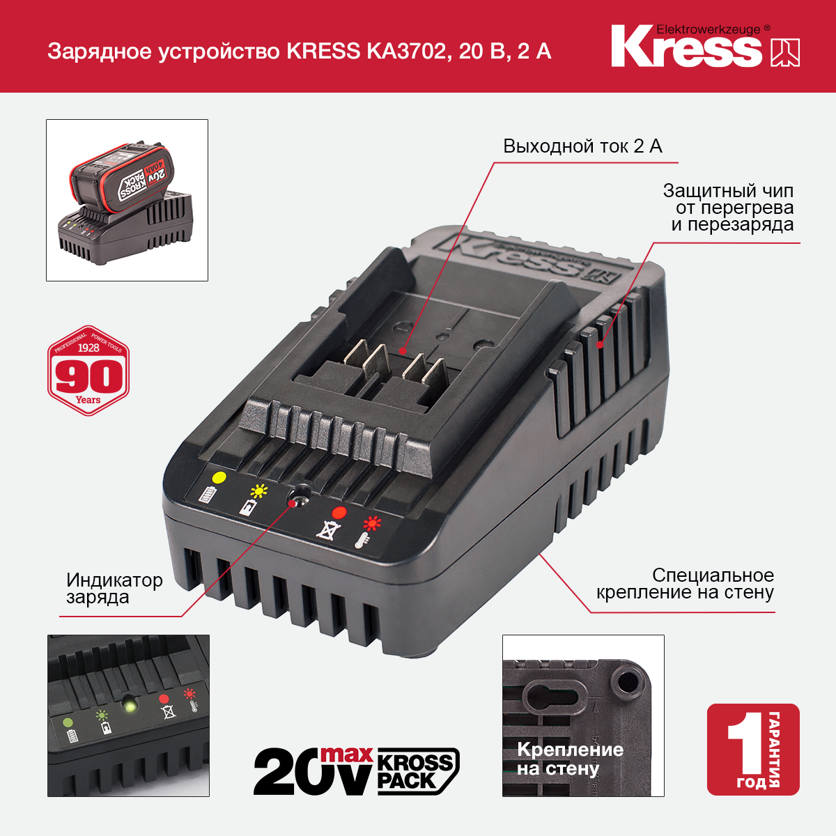 Зарядное устройство KRESS (модель KA3702) - предназначено для зарядки аккумуляторных батарей KRESS с напряжением 20В.