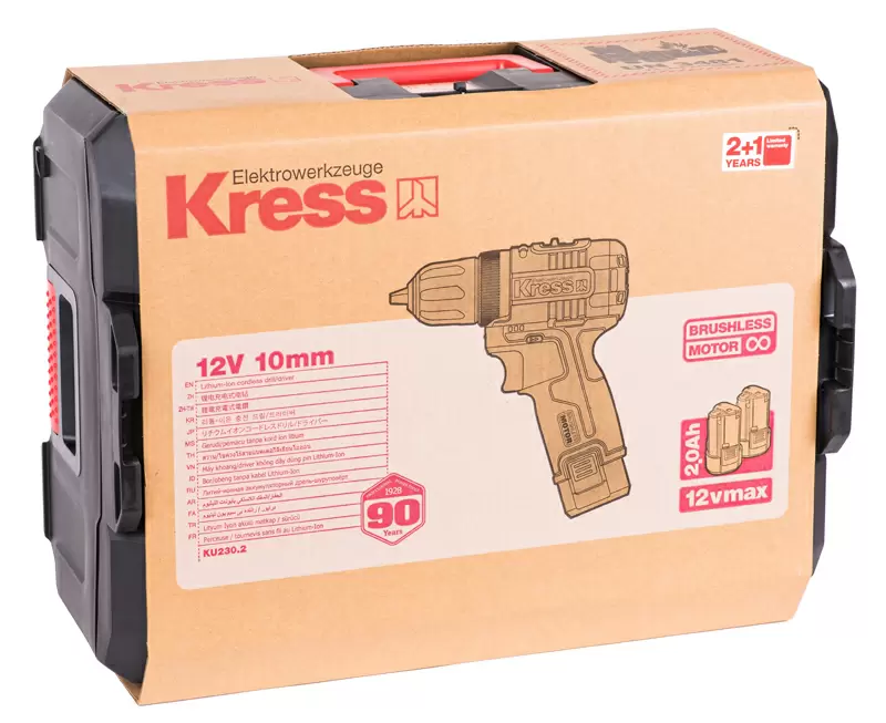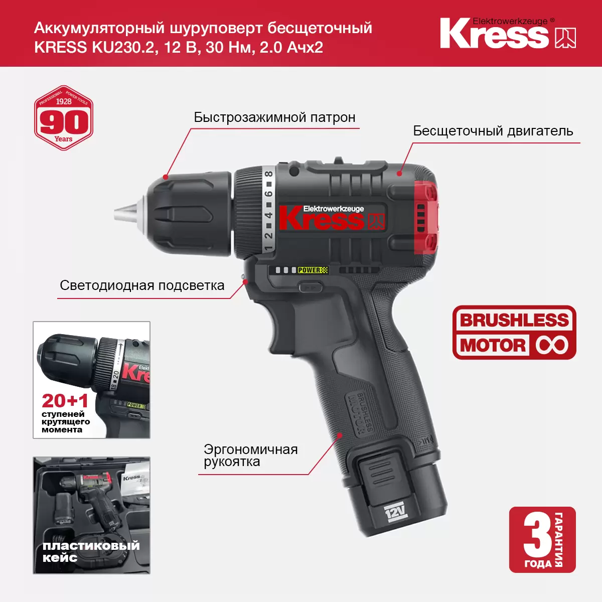 KRESS, KU230.2 это универсальная, компактная и легкая дрель-шуруповерт c бесщеточным двигателем. Который значительно улучшает характеристики устройства по сравнению с щеточной моделью. А именно благодаря такому типу мотора шуруповерт меньше нагревается, работает до 50% дольше и имеет на 25% больше крутящий момент. А самое главное срок службы мотора до 10 раз дольше. Быстрозажимной 10 мм патроном с блокировкой шпинделя для фиксация оснастки одной рукой. А также 2 рабочие скорости, одна предназначена для работы с крепежом, а вторая для сверления. Наличие муфты регулировки крутящего момента(20+1 позиций ступеней) позволит максимально точно выбрать режим работы. Шуруповерт оснащен светодиодной подсветкой рабочей зоны. Поставляется в комплекте с 2-мя аккумуляторами KRESS 12В 2 А*ч. Аккумуляторы KRESS оснащены электронной платой управления с защитой от глубокого разряда и перегрева, что продлевает срок службы и увеличивает время работы. Данная модель поставляется в кейсе.