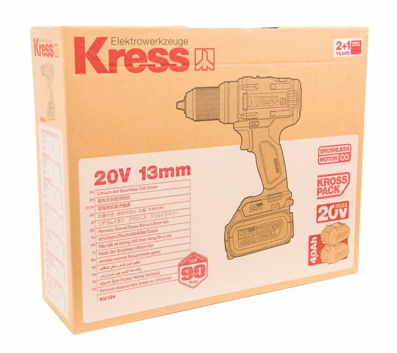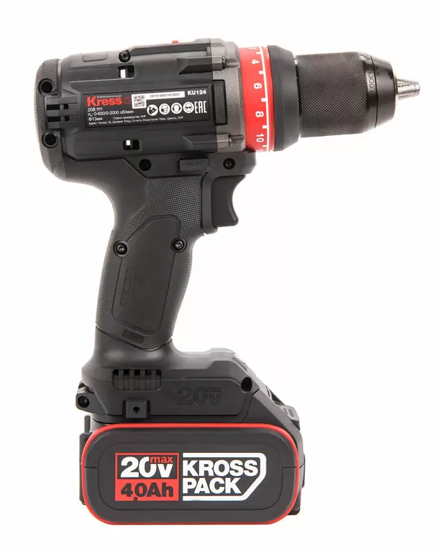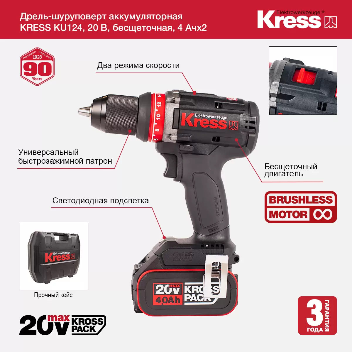 KRESS KU124 это универсальная, безударная, компактная и легкая дрель-шуруповёрт c инновационным бесщеточным двигателем. Который значительно улучшает характеристики устройства по сравнению с щеточной модели. А именно благодаря такому типу мотора дрель-шуруповёрт меньше нагревается, работает до 50% дольше и имеет на 25% больше крутящий момент. А самое главное срок службы мотора до 10-ти раз дольше. Модель оснащена быстрозажимным 13 мм, полностью металлическим патроном с блокировкой шпинделя - фиксация оснастки одной рукой. А также 2 рабочие скорости, одна предназначена для работы с крепежом, а вторая для сверления. Наличие муфты регулировки крутящего момента(22+1 позиций ступеней) позволит максимально точно выбрать режим работы. Дрель оснащена светодиодной подсветкой рабочей зоны. Поставляется в комплекте с 2-мя аккумуляторами KRESS KROSSPACK® 20В 4 А*ч, которые взаимозаменяемы с другими инструментами и садовой техникой KRESS. Аккумуляторы KRESS оснащены электронной платой управления с защитой от глубокого разряда и перегрева, что продлевает срок службы и увеличивает время работы. Данная модель поставляется в кейсе с зарядным устройством с функции быстрой зарядки за 1 час.