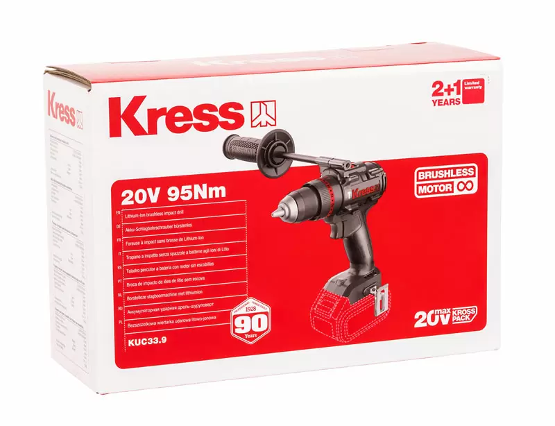 KRESS KUC33.9 это универсальная, дрель-шуруповёрт c инновационным бесщеточным двигателем, который значительно улучшает характеристики устройства по сравнению с щеточными моделями. А именно благодаря такому типу мотора дрель-шуруповёрт меньше нагревается, работает до 50% дольше и имеет на 25% больше крутящий момент. Срок службы мотора до 10-ти раз дольше. Модель оснащена быстрозажимным 13 мм, полностью металлическим патроном с блокировкой шпинделя позволяющим фиксировать оснастку одной рукой. Двухскоростной редуктор позволяет выбрать нужную скорость, одна предназначена для работы с крепежом, а вторая для сверления. Муфта регулировки крутящего момента 18+1+1 ступеней регулировки) позволит максимально точно выбрать необходимый режим работы. Максимальный крутящий момент в 95Нм позволит справится с огромным множеством тяжелых задач. Максимальная производительность данного шуруповерта достигается при использовании аккумуляторов ёмкостью 4Ач и более.