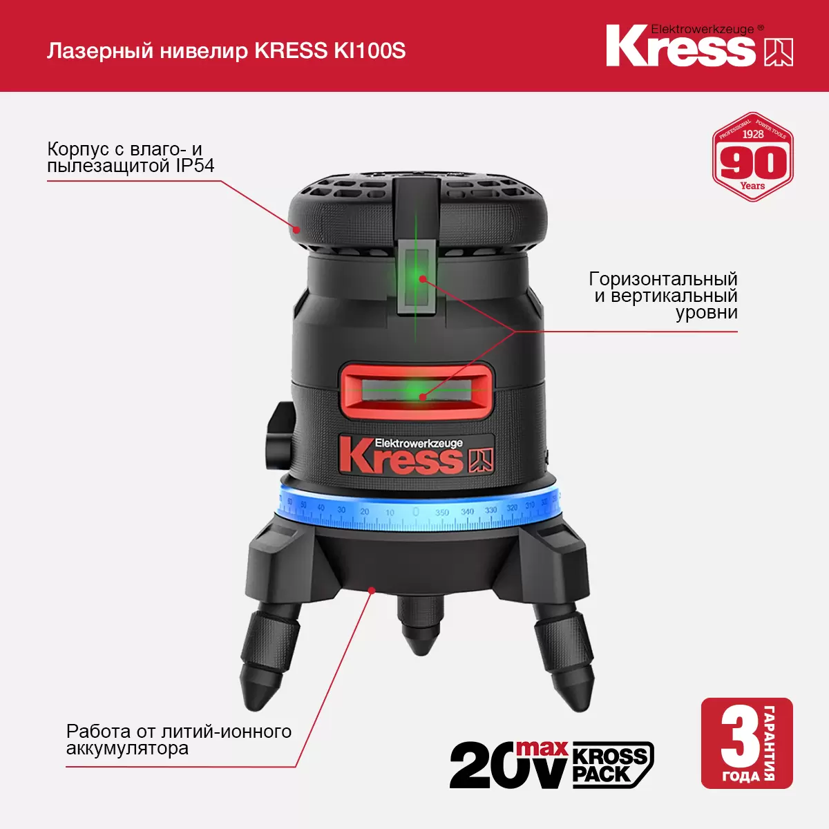 Лазерный нивелир KRESS KI100. Сверхвысокая точность измерений благодаря уникальной конструкции устройства. Питание от аккумулятора и USB адаптера. Защита от пыли и капель IP54. Литиевая батарея большой емкости. Вертикальная и горизонтальная линия.