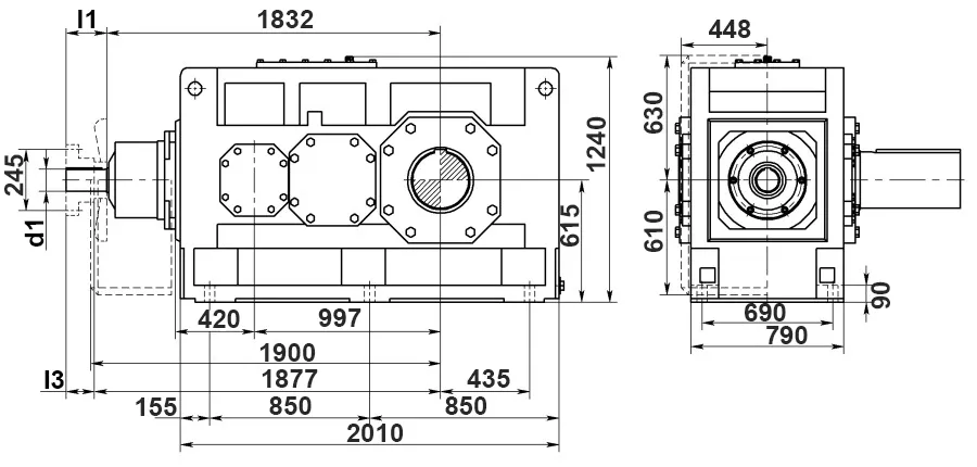 Индустриальный цилиндро-конический редуктор B3.H19 имеет три передаточные ступени: в двух из них установлены зубчатые передачи с цилиндрическими зубчатыми колесами, в одной — с коническими. Оси валов расположены под прямым углом. Крутящий момент редуктора — до 300 000 Н*м. Расчетная мощность электродвигателя — до 3000 кВт. Редуктор может комплектоваться сплошным или полым выходным валом со стяжной муфтой или эвольвентным шлицем.