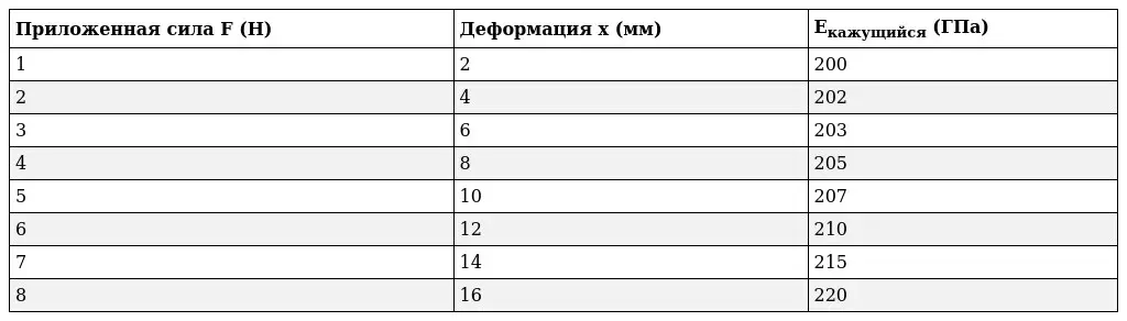 Расчеты: Для расчетов в таблице 1 предполагается: L₀ = 100 мм, A = 1 мм². Значения Eкажущийся вычисляются по формуле, приведенной выше.